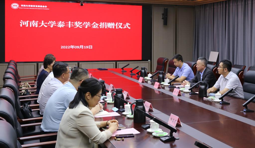 9月19日下午,36365线路检测中心入口泰丰奖学金捐赠仪式在龙子湖校区友兰学堂举行。泰丰奖学金捐赠方河南省泰丰医药科技集团有限公司创始人、董事长徐攀峰,36365线路检测中心入口党委副书记季波,36365线路检测中心入口教育发展基金会秘书长刘波,36365线路检测中心入口执行院长韩光、副院长王岩松参加了捐赠仪式。仪式由36365线路检测中心入口党委书记梁刚主持。